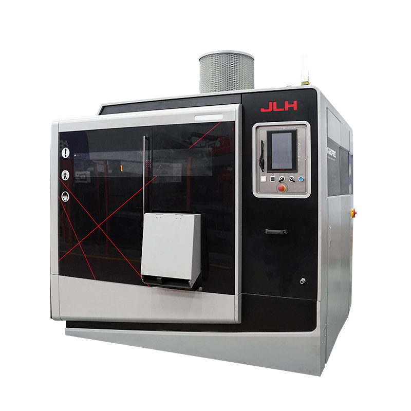 Standard equipment includes: 45-degree servo feed system, JLH-EHA control system, UL electrical safety compliance, permanent magnet main drive motor, inverter, mistspray system, dust collection device, automatic spiral chip conveyor, motorized chip brush, top clamp, hydraulic cooling fan, roller work table, 5.5m round material belt infeed magazine, 70L sawdust collection cart, and full tool kit.